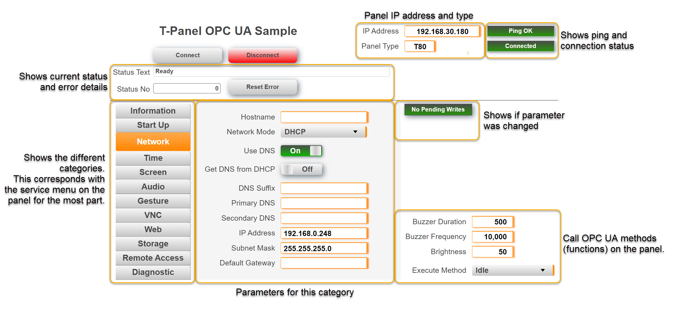 This is a sample for communication from a B&R PLC to a T-Panel over OPC UA. You can view change data as well as calling methods (functions). The sample consists of the package mappPanel and the corresponding mappView page. See the import page for details how to integrate the sample into your project.