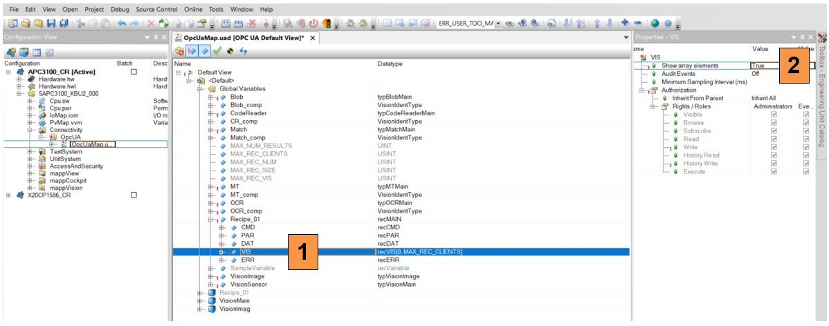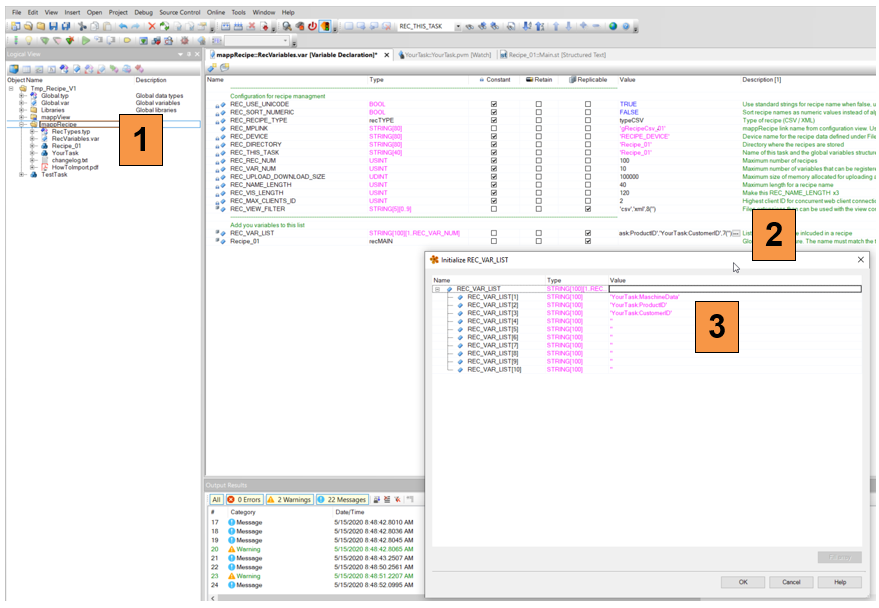 Select the global variable “Recipe_01” and “RecipeData”, If the variables does not show up, save and compile the project, then reopen the window